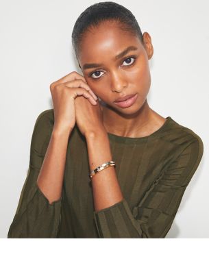 ブランドを象徴するコレクションより登場した、ICON(アイコン)スタッズ カフ。シグネチャーの円形ダブルTロゴが、グラフィックなスタッズになりました。重ね着けでも単独でもお使いいただける、クラシックなブレスレット。