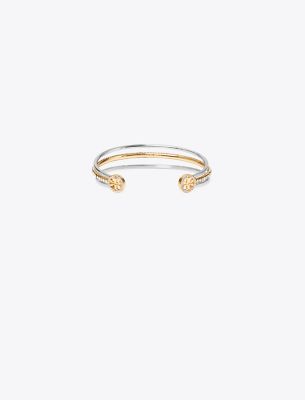 ブランドを象徴するコレクションより登場した、ICON(アイコン)パヴェ カフ。シグネチャーの円形ダブルTロゴをグラフィックなスタッズにアレンジしました。3つのブレスレットをひとつにまとめたようなデザイン。メタルとパヴェクリスタルを組み合わせています。