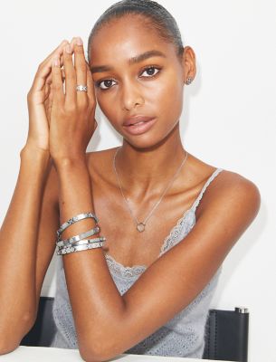 アイコニックなダブルTモチーフにインスパイアされたジュエリーコレクション。シンメトリーが描く力強さと美しさ、そしてタイムレスなスタイルの融合。シグネチャーパターンにクリスタルをあしらった、ICON(アイコン)Tモノグラム ヒンジブレスレット。コレクションの他のアイテムや、お手持ちのジュエリーと組み合わせて。