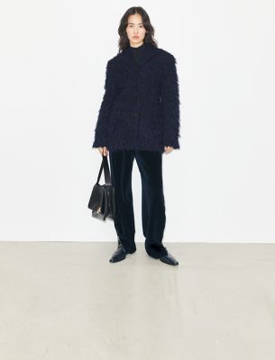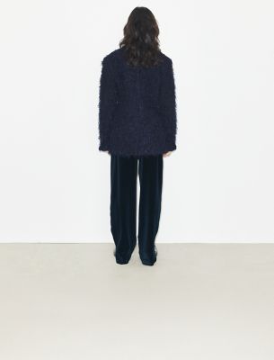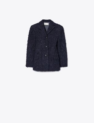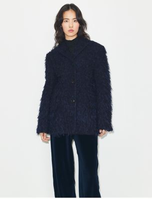 ひねりを効かせたアメリカンスポーツウェアのアイデアを探る新作コレクション。2025年秋のランウェイに登場したテーラードブレザーを、遊び心のあるテクスチャーでアップデート。イタリアで最も有名な名門ミル(生地メーカー)のウールを使用し、フリンジをファブリックに直接織り込んでファーのような質感に仕上げました。