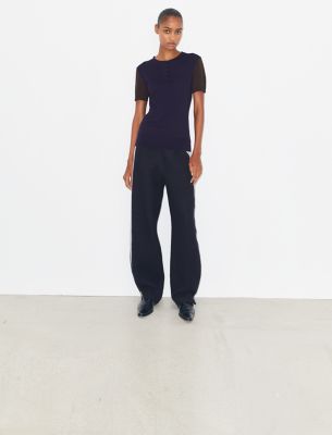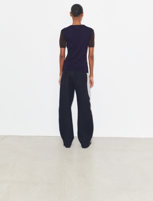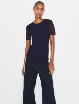 ひねりを効かせたアメリカンスポーツウェアのアイデアを探る新作コレクション。2025年秋のランウェイで登場した、バイカラーのヘンリーネック。日本の名門ミル(生地メーカー)から調達したウールを使用しました。お揃いのカーディガンの下に着れば、エレガントで個性的なセットアップが完成します。