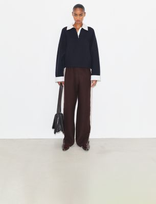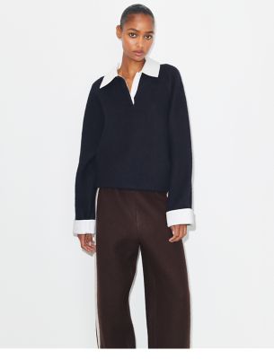 かっちりとした表面と柔らかな起毛の裏地を組み合わせた、日本製ダブルフェイスフリースを使用したウール ラグビー ポロシャツ。ラグランスリーブをあしらい、コントラストの効いたコットンの襟と袖口を配したデザインです。お揃いのスウェットパンツと合わせれば、リラックス感がありながらも洗練されたセットアップが完成します。
