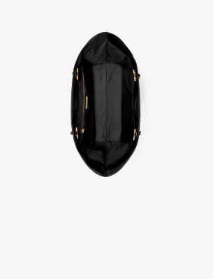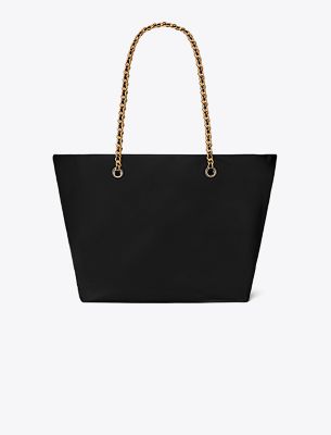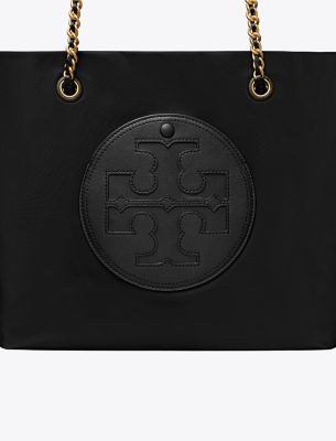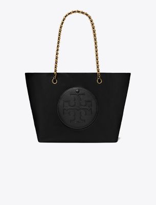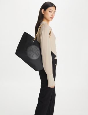 一目でそれとわかる、エラ チェーン トート。羽のように軽いリサイクルナイロンを使用した柔らかなデコンストラクトシルエットに、ブレイドチェーンストラップを合わせました。普段使いにも旅行にも最適で、ノートパソコンなどの必需品をすべて収納できるゆとりの容量を備えています。