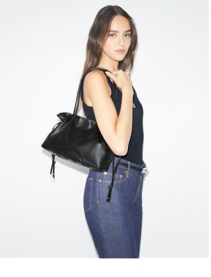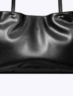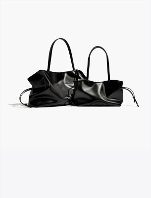このエラ ドローストリング スモール トートバッグは、natuura™と提携して製造されています。責任ある方法で調達された天然ゴムと認定されたリサイクル素材から作られた革新的な新素材、Lucida Mat™を使用しました。さりげない光沢のある、しなやかな肌触り。ドローストリングで絞る、ソフトでルーズなデザイン。エラのシグネチャーであるダブルTロゴをオーバーサイズにアレンジし、底面に配しました。