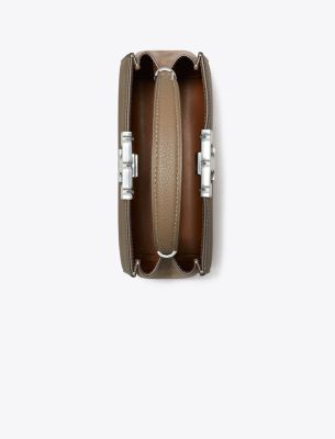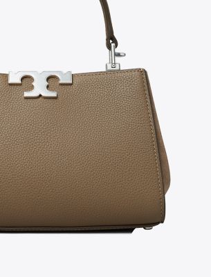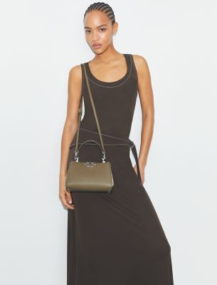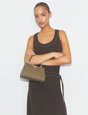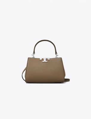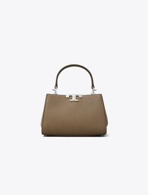 ペブルドレザーを使用し、スエードのトリムを施した、エレノア ミニサッチェル。かっちりとしたクリーンなラインに映える、ハードウェアの彫刻的なフォルムと大胆なカーブ。気軽に持ち運べるよう、トップハンドルと取り外し可能なクロスボディストラップをあしらいました。職人技が凝縮されたデザインです。