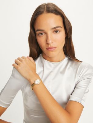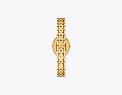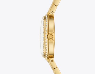 - パヴェストーンをあしらったゴールドトーンのステンレススチール製のケースとブレスレット