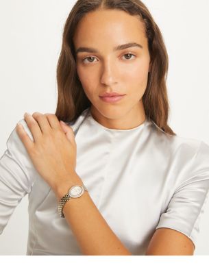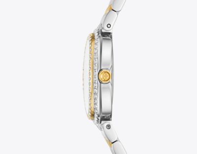 - パヴェストーンをあしらったゴールドとシルバートーンのステンレススチール製のケースとブレスレット