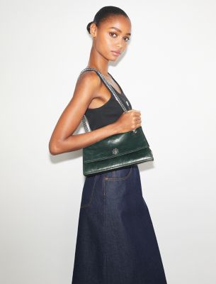 キラ ターンロック ショルダーバッグが登場。角度をつけたシャープなフォルムに、大ぶりのカーブチェーンストラップとターンロックなどの印象的な金具をあしらいました。さりげない質感のあるレザーを使用したクラシックなフラップシルエット。内側の3つのコンパートメントは拡張可能で、整頓に便利なデザイン。
