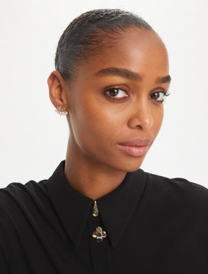 ジュエリーボックスの定番アイテムにひねりを加えた、キラ パール フロントバック ピアス。クリスタルをあしらったダブルTスタッズとトリプルパールジャケットの2つのパーツで構成され、着用すると1つのピースのように見えるデザインです。どんなルックも斬新に仕上げます。