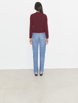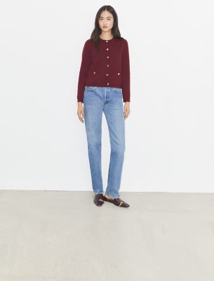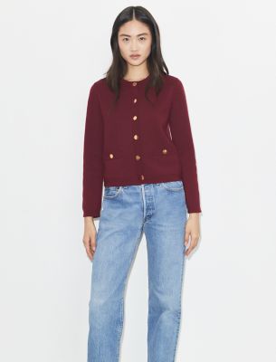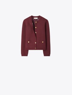 セーターをテーラード風にアレンジ。ソフトウールのニットに光沢のあるメタルボタンをあしらい、内側にはTモノグラム ジャガードを配したケンドラ カーディガン。