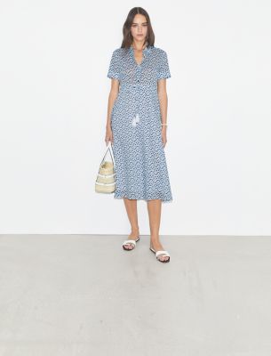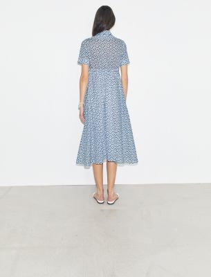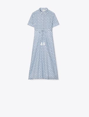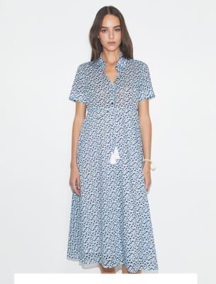 ピュアコットンを使用し、軽やかなロング丈に仕上げた、着回しのきくプリント シャツワンピース。ゆったりとしたシルエットを調節できる、ウエストのドローストリングには、ビーズ付きタッセルのコードエンドをあしらっています。