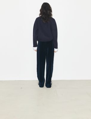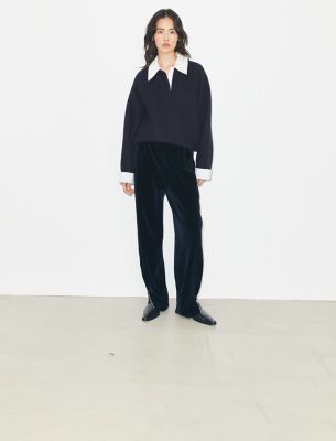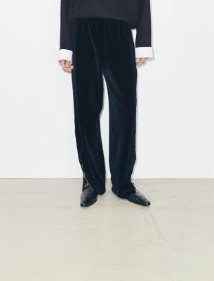 ひねりを効かせたアメリカンスポーツウェアのアイデアを探る新作コレクション。2025年秋のランウェイに登場したスウェットパンツは、コントラストの効いたサイドパネルと、着回しのきく足首のファスナーでワンランク上の印象に。イタリアの名門ミル(生地メーカー)から調達したストレッチコットンベロアを使用し、美しいドレープを描くゆったりとしたシルエットに仕上げました。
