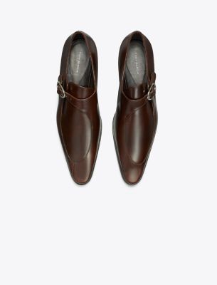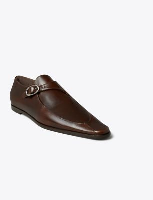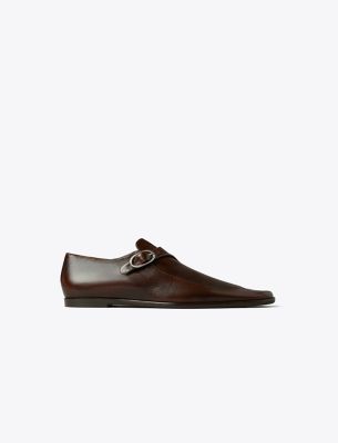 2025年秋のランウェイで登場したシューズ。メンズウェア風のモンクストラップを、長めのポインテッドトゥ、オフセンターのシームライン、ソールのフラットなデザインでアップデート。レザーにクッション性のあるインソールを組み合わせ、メタルバックル留めで仕上げました。