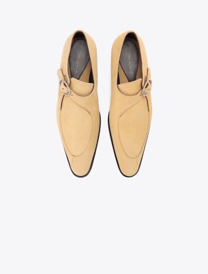 2025年秋のランウェイで登場したシューズ。メンズウェア風のモンクストラップを、長めのポインテッドトゥ、オフセンターのシームライン、ソールのフラットなデザインでアップデート。ソフトなヌバックレザーにクッション性のあるインソールを組み合わせ、メタルバックル留めで仕上げました。