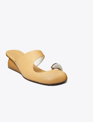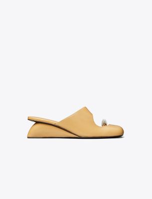 ブランドを象徴するシュールなデザインを、彫刻的なミュールウェッジとして表現。このスリッポンシューズは、丸みをつけたエッジ、大きなカットアウト、トゥリングのメタルパーツが魅力です。柔らかいパッドの入ったフットベッドを、スクエアフォルムのソールよりも長くすることで、宙に浮いているかのような印象を演出。フューチャリスティックで繊細なデザインを際立たせています。