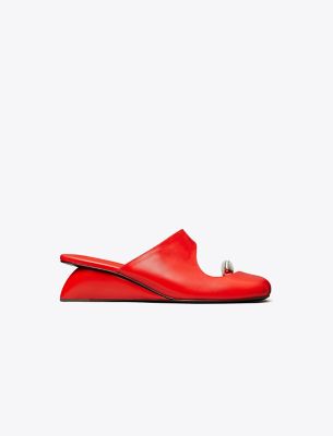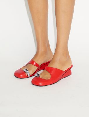 ブランドを象徴するシュールなデザインを、彫刻的なミュールウェッジとして表現。このスリッポンシューズは、丸みをつけたエッジ、大きなカットアウト、トゥリングのメタルパーツが魅力です。柔らかいパッドの入ったフットベッドを、スクエアフォルムのソールよりも長くすることで、宙に浮いているかのような印象を演出。フューチャリスティックで繊細なデザインを際立たせています。