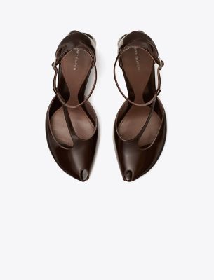 2025年秋のランウェイで登場したピープトゥサンダル。波打つようなフォルムを探求し続けるアイテムです。動いているかのようなデザインのツイストした彫刻的なヒールに、Tストラップやピープトゥといったアシンメトリーなラインが際立つエレガントなサンダル。繊細なバックルが付いたアンクルストラップで仕上げた、洗練されたシルエットです。
