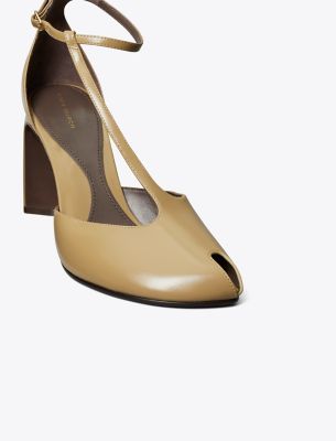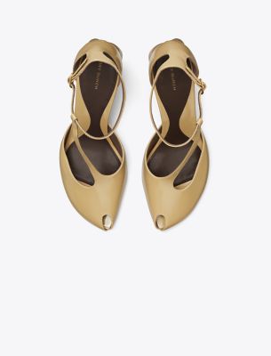 2025年秋のランウェイで登場したピープトゥサンダル。波打つようなフォルムを探求し続けるアイテムです。動いているかのようなデザインのツイストした彫刻的なヒールに、Tストラップやピープトゥといったアシンメトリーなラインが際立つエレガントなサンダル。繊細なバックルが付いたアンクルストラップで仕上げた、洗練されたシルエットです。