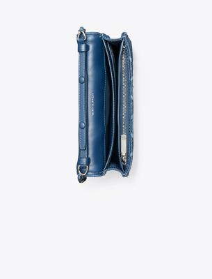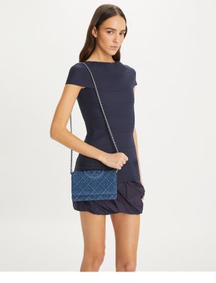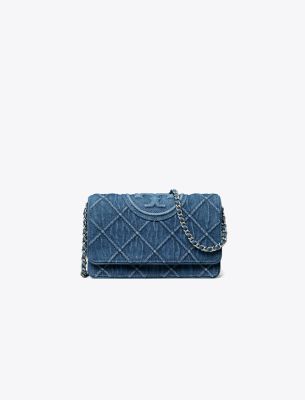 ダイヤモンドパターンのピンタックとエンボス加工のダブルTロゴをあしらった、フレミング ソフトデニム クロスボディバッグ。 デニムを編み込んだチェーンストラップで仕上げた、多機能なウォレット型シルエットで、カード、スマートフォン、紙幣を収納できるポケットを備えています。紙幣を折りたたむことなく収納できます。