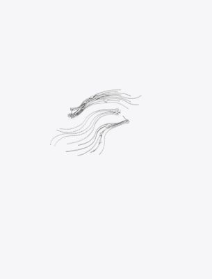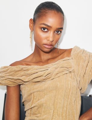 秋のランウェイで登場したアイテムからインスパイアされた、しなやかなヘリンボーンチェーン。1970年代のニューヨークとアールデコの幾何学模様を彷彿とさせるデザインです。クリスタル ロゴ ピアスは、ストーンスタッズをフロントに、シグネチャーのダブルTロゴとカスケードチェーンを裏側にあしらっています。