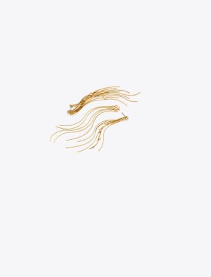 秋のランウェイで登場したアイテムからインスパイアされた、しなやかなヘリンボーンチェーン。1970年代のニューヨークとアールデコの幾何学模様を彷彿とさせるデザインです。クリスタル ロゴ ピアスは、ストーンスタッズをフロントに、シグネチャーのダブルTロゴとカスケードチェーンを裏側にあしらっています。