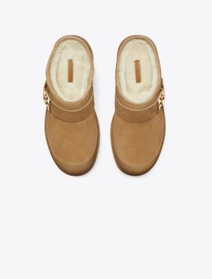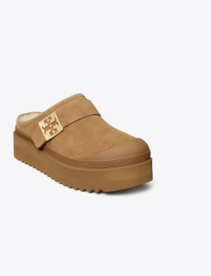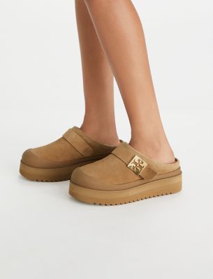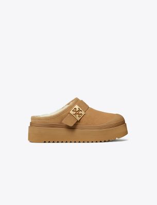 ラグジュアリーなデザインにリラックス感が漂うメロー ミュール。お出かけ中もスリッパの暖かさを感じられる一足です。スエードと、ラグジュアリーなシアリングのライニングを組み合わせました。プラットフォーム フットベッドとラグソールを合わせ、ダブルTの装飾メタルパーツをあしらっています。