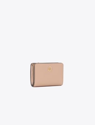 Toryの両親、BuddyとReva Robinson、そして二人の旅への愛にちなんで名付けられたコレクション。美しいペブルドレザーを使用した、ロビンソン バイフォールド ウォレット。ミニバッグにもぴったりのサイズで、コインポケットを含む複数のコンパートメントを備えています。