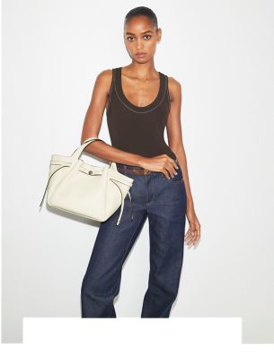 ソフトなペブルドレザーを使用し、ゆるやかなギャザーを寄せたロミー スモールトートバッグ。ゆとりのあるコンパートメントと、小物を整理できる大きなポケットを備えた、毎日活躍する軽量バッグです。スリムなベルトと、新デザインのボタンロゴをあしらいました。トップハンドルとクロスボディストラップの2通りの持ち方が楽しめます。