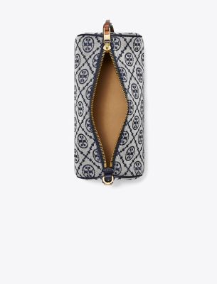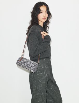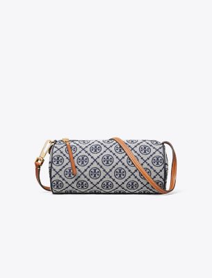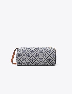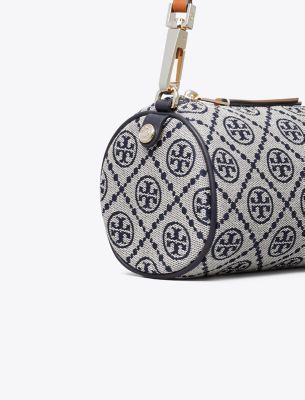 ウーブンジャガードを使用したTモノグラム シリンダーバッグ。安全なファスナー開閉と、バッグチャームを取り付けられるピンスナップ付き。小脇に抱えて、または肩に掛けてお使いいただけます。