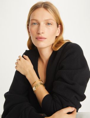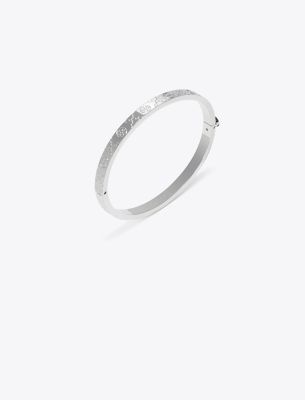 5mm幅のバンドにシグネチャーパターンをあしらった、Tモノグラム ヒンジブレスレット。コレクションの他のアイテムや、お手持ちのジュエリーと組み合わせて。